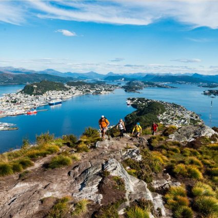The trail to the summit of Mount Sukkertoppen is over easy terrain with a moderate elevation gain. Upon reaching the top, you will be rewarded with amazing views of Ålesund and the nearby islands. You will then hike back to the kayaks and paddle back to the starting point.