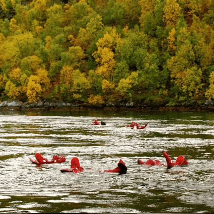 This excursion is not for the light-headed. Here you have the opportunity to experience Senja in a complete different way. Jump into the cold Arctic water and float down the Arctic stream (also known as Mælstrøm) alongside a knowledgeable guide with speeds reaching up to 7 knots (13km/h). The red survival suits will keep you warm and dry as you make your way down the stream spinning carefully around in the current.