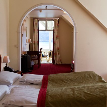 Demi Suites in the historic building are all unique and each have its own character. Some of the rooms are in the east-facing wing, others in the front of the Swiss style building. Most have balconies and they all have spectacular views of the Sognefjord. Demi Suites are bigger then the standard rooms and have a sitting area. Some rooms have queen size beds.