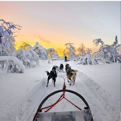 Experience the excitement of riding with a team of huskies through the pristine, snow-covered fells of Finnish Lapland. Feel the rush of Arctic adventure as you travel through the white, shimmering landscapes and forests. The sled glides effortlessly over fresh snow as you explore the sparkling wilderness.
