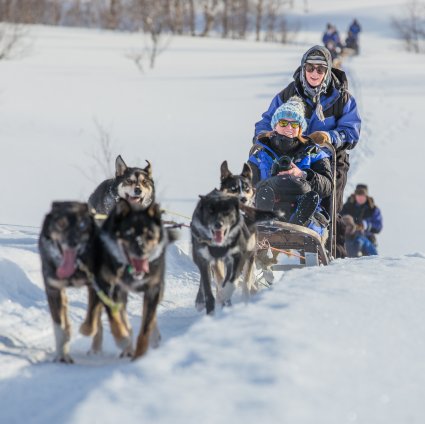 Full day dog sledding excursion from Tromsø to Lyngsfjord. Drive your own team of huskies through the stunning Vass valley - an uninhabited forest landscape surrounded by towering mountains.
