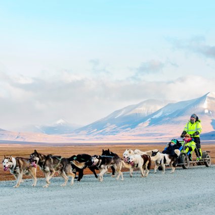 Experience unique arctic scenery. Join an exciting tour with polar dogs pulling wheeled carts in the Advent Valley during the summer season, when the snow has started melting.