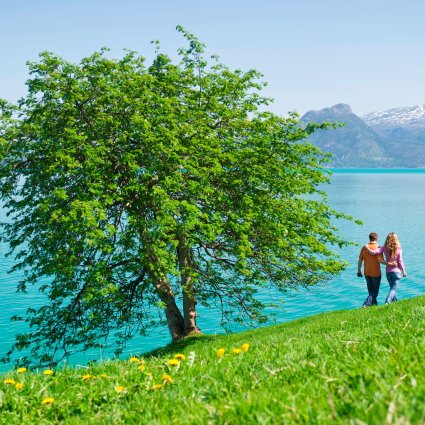 The Hardangerfjord is the second largest fjord in Norway, and famous for its fruit orchards. The contrast created by green hillsides, orchards in blossom and snow-clad mountains has inspired many, and among them the well known Norwegian composer Edvard Grieg with his famous composition «Spring».