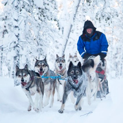 Handle your own husky team as you go dog sledding through the Arctic wilderness and through the beautiful Lake Inari region in Finnish Lapland.