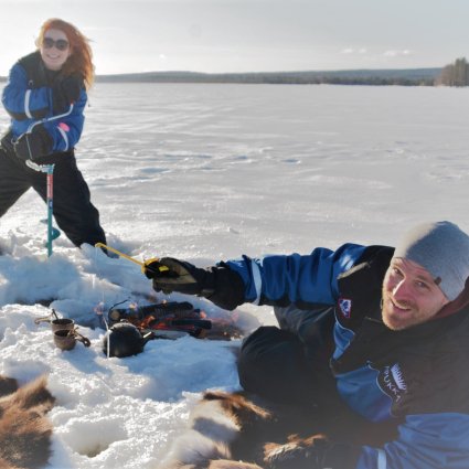 Lay down on the reindeer skin, enjoy a hot drink by the fire and simply wait for the perch and other freshwater fish species to find their way to you!