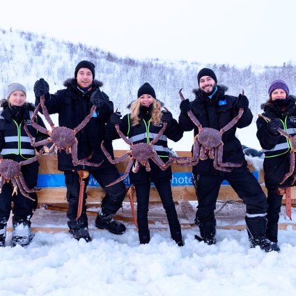 You will be picked up at your hotel for the transfer to the fjord near Kirkenes. The guide will take you by snowmobile sledge out on the fjord ice. On the ice, you will learn how to catch King Crabs and even see how to prepare it. You can pose with the King Crabs for a photo before heading to a small and cosy restaurant.
