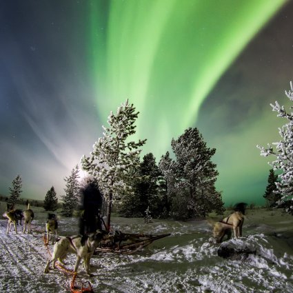 At the Snow Hotel, more than 140 huskies are waiting eagerly to go on this tour with you. You will ride deeper into the wilderness where you can enjoy the magnificent Arctic night filled with stars.
