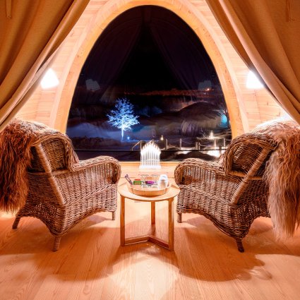 Stay in a warm beautifully designed wooden cabin with modern architecture built in the wilderness. The cabins are manufactured from the traditional hunting and fishing huts “gamme” that can be found in the wilderness in the Sami areas of the Arctic. The cabin has a spacious room and a panoramic window from where you can admire the midnight sun.