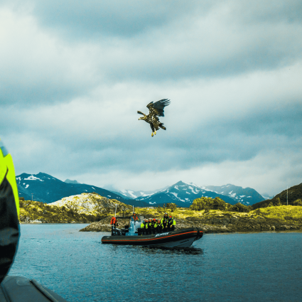 Join a guided sea eagle safari by RIB boat to Trollfjorden. The Trollfjord lies between the Lofoten Islands and Vesterålen archipelago.