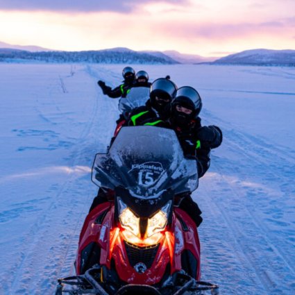This safari is ideal for beginners and first timers who would like to try snowmobiling. The trail runs on the frozen Lake Kilpisjärvi and through beautiful snowy birch forest to Koltavuoma where the yellow border cairn of three Nordic countries is located.