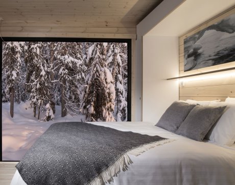 The modern Panorama Design Huts are made from local pine wood and represent modern Lappish architecture. Each hut (16,5 m2) has a full-size window with views to the beautiful wilderness forest. The hut is suitable for 2 persons, with 1 extra bed for a child (arm chair 70x190cm) available in some of the huts. The huts are equipped with modern amenities such as flat-screen TV, microwave, Nespresso coffee machine, kettle and Wi-Fi. The bathroom is compact and equipped with a hairdryer, shampoo, and conditioner.